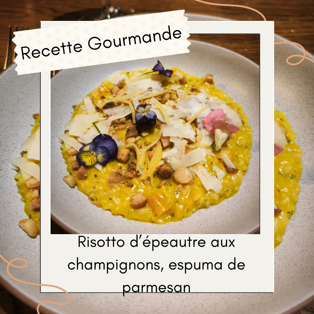 Le risotto en fait partie. On pense immédiatement au riz, à la crème, au geste circulaire patient. Ici, on change légèrement la partition : l’épeautre remplace le riz. Grain ancien, plus ferme, plus rustique, il apporte une texture différente, une profondeur presque noisettée.